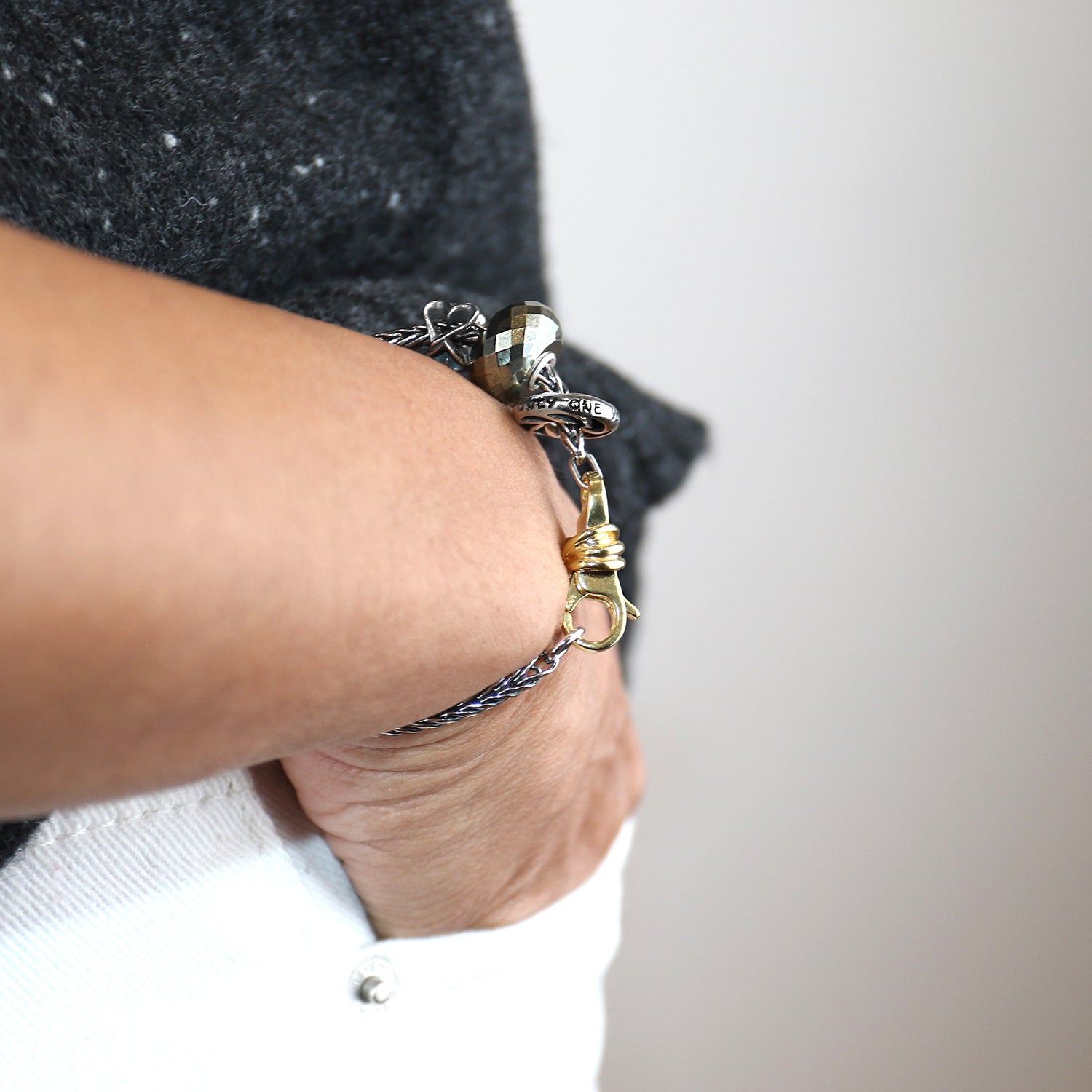 The Lucky Knot Bracelet, Gold Plated pairs a sterling silver foxtail chain with an 18k gold-plated Lucky Knot Clasp for a warm, celebratory finish. Created as a blank canvas, this bracelet lets you mark the Trollbeads Jubilee by selecting the beads that tell your story, your way.