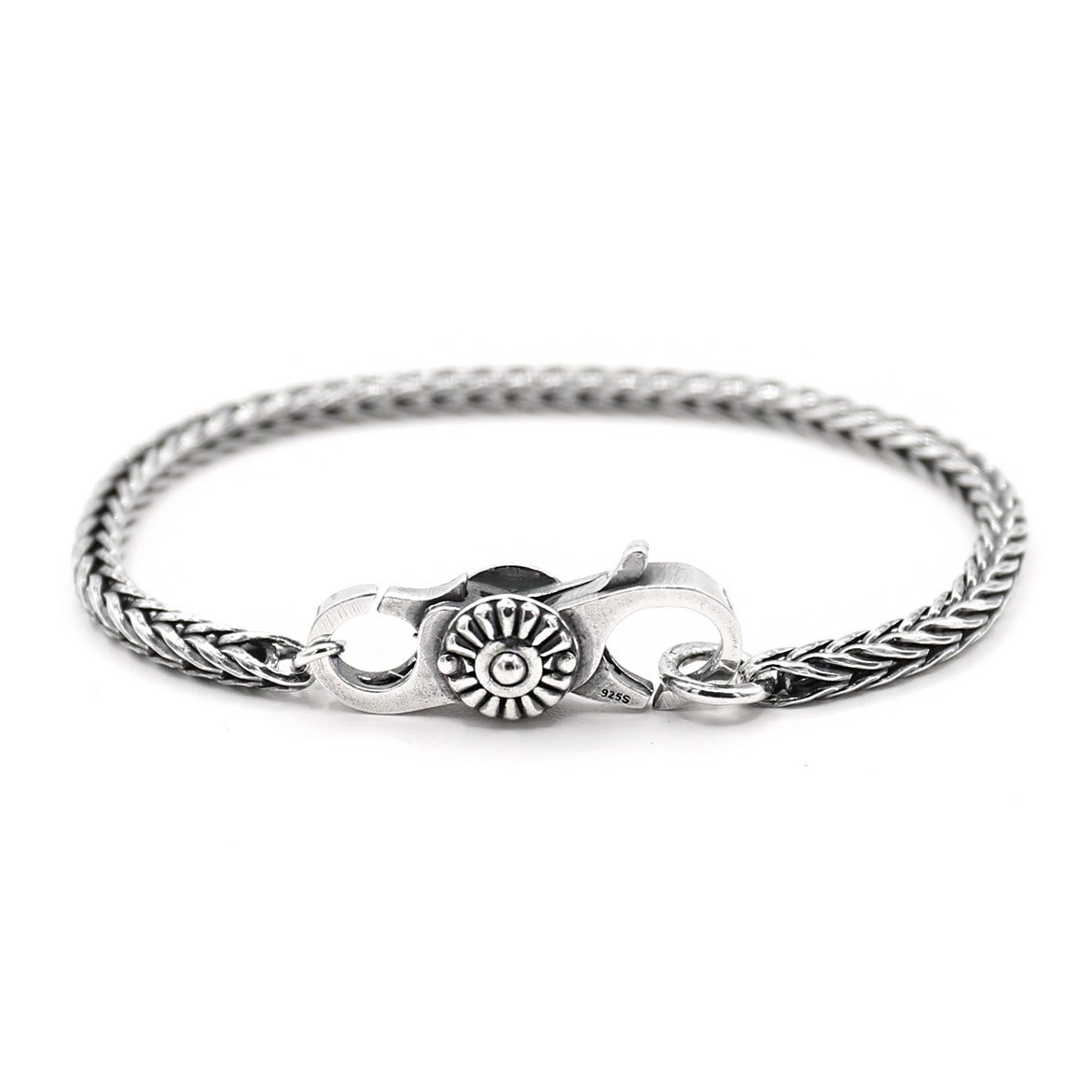 The oxidized Sterling silver bracelet has been masterfully handcrafted into Trollbeads' signature foxtail chain. The Foxtail chain consists of joints that are not soldered together, which makes the chain very flexible. The bracelet comes with the Daisy Clasp.