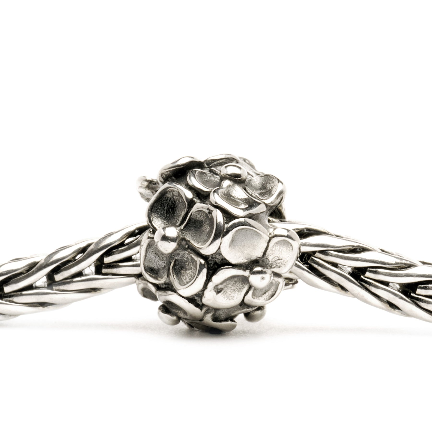 Tiny hydrangeas cluster around the surface of this silver bead, just as they do in nature.
