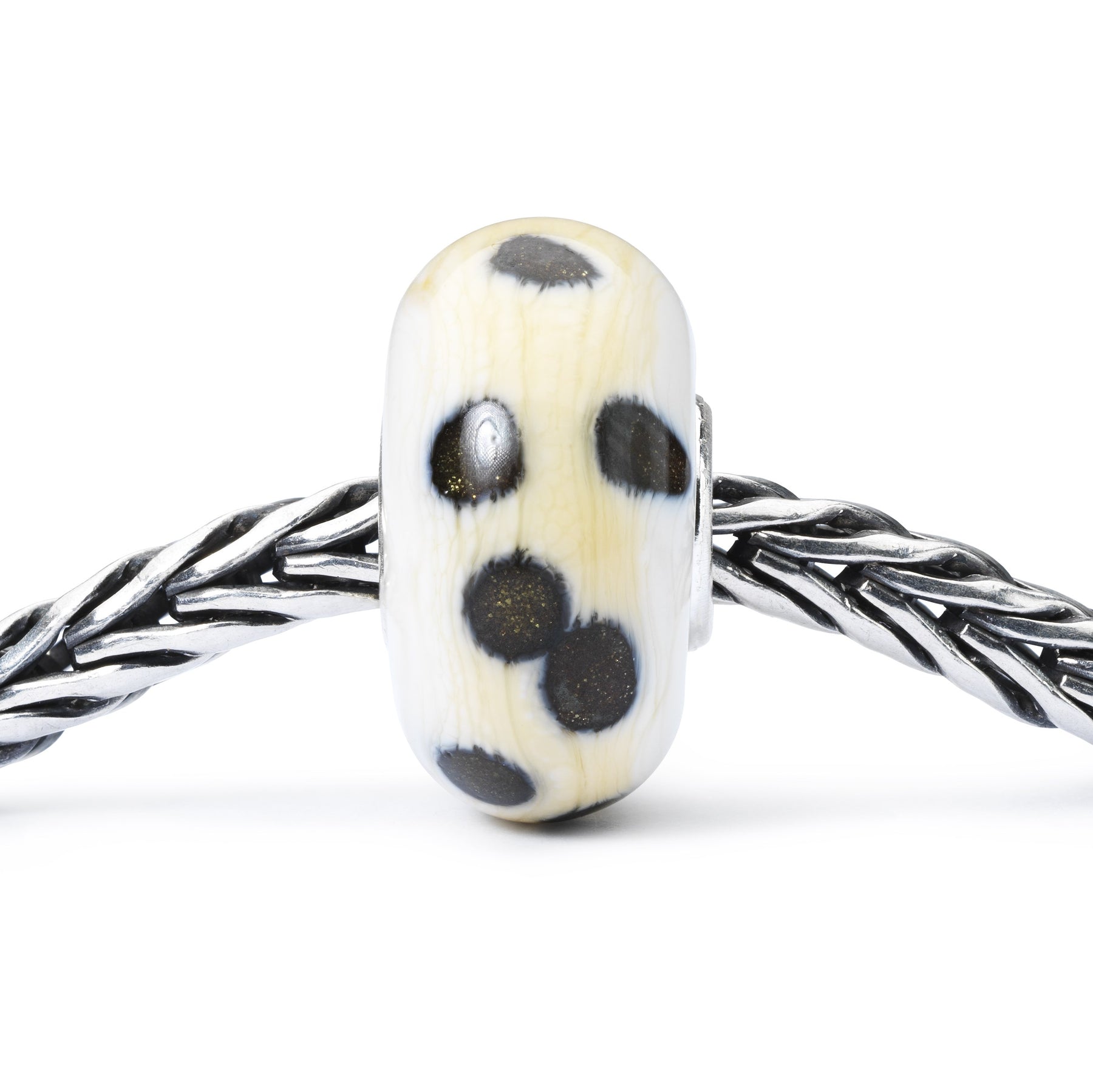 Bold, contrasting dots in marble tones create a striking pattern. This bead is full of character, perfect for adding a modern twist to your collection.