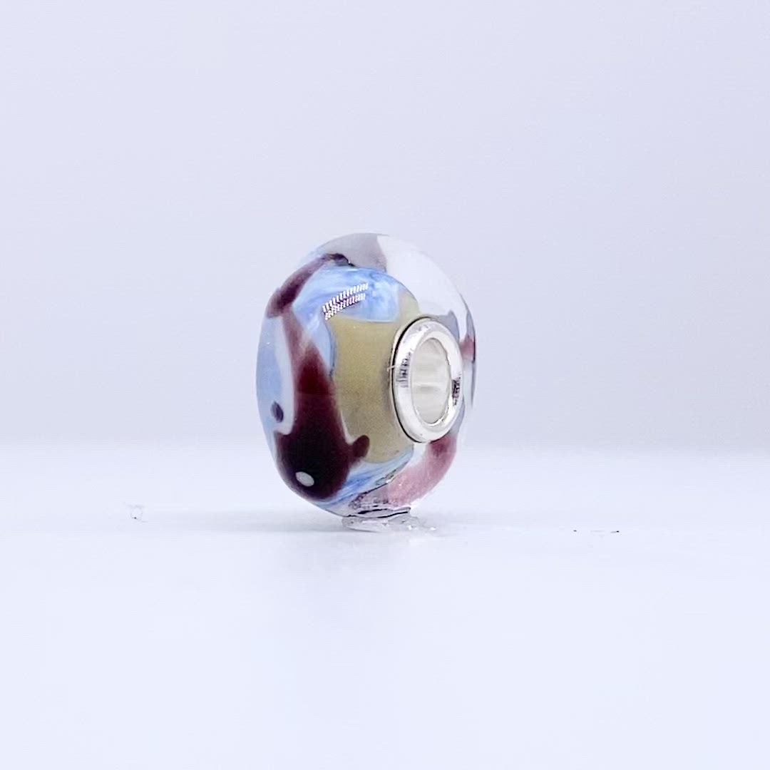 This high-quality, handcrafted glass bead pictures an illustration of an Orca of the oceanic dolphin family in white and black. Underneath the Orca, a blended combination of the colours blue, camel and white represent the ocean and the beach. At the centre, a sterling silver core gives the perfect finishing touch.