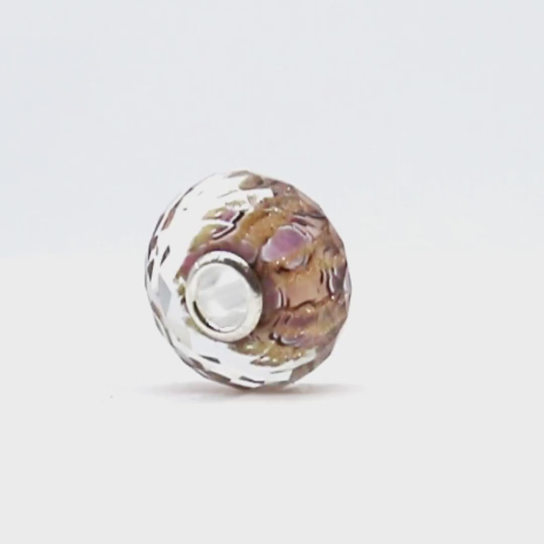 This is where the combination of lilac, blush and bronze collide to give this bead vibrancy and sparkle. Crafted with faceted glass, it conjures the illusion of a matrix delicately forming and entwining across its surface. The result is a captivating interplay of delicacy and vibrancy, where each hue dances in harmony, igniting the senses with its radiant allure.