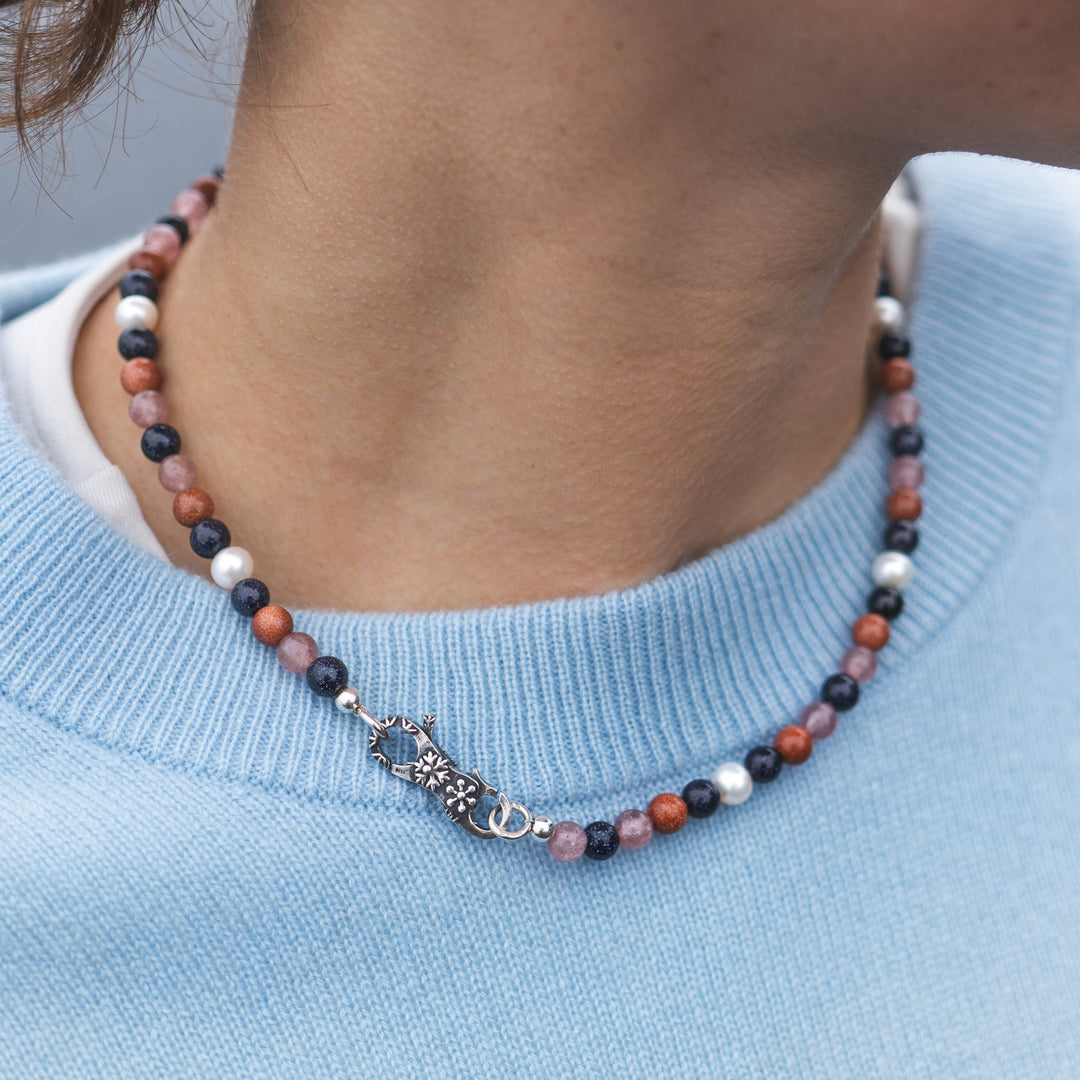 The Dream of Empowerment Necklace weaves together shimmering Blue Goldstone for wisdom, fiery Red Goldstone for courage, gentle Strawberry Quartz for love and confidence, and lustrous White Freshwater Pearls for grace. Together, they create a harmonious reminder to walk through life with resilience, self-belief, and purpose, empowering you to embrace every step of your journey.