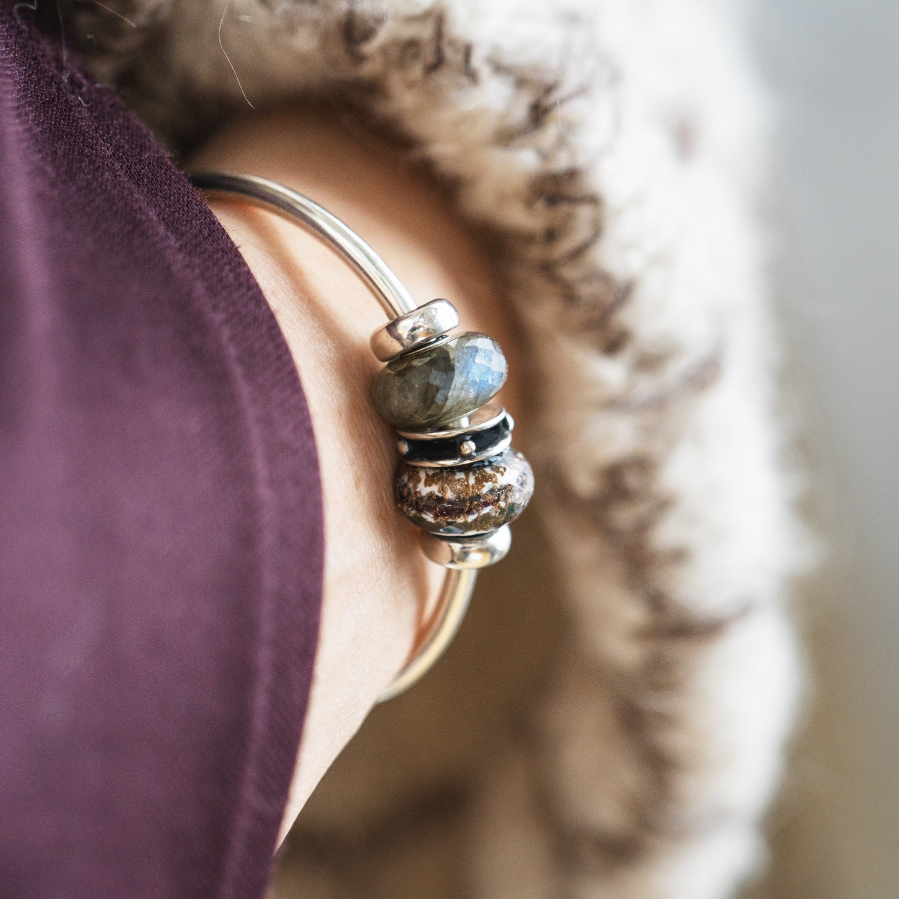 The beads are secured by two sterling silver spacers on our solid Sterling Silver Bangle. The result is a balanced and versatile statement piece that’s as suited to daily wear as it is to special occasions.