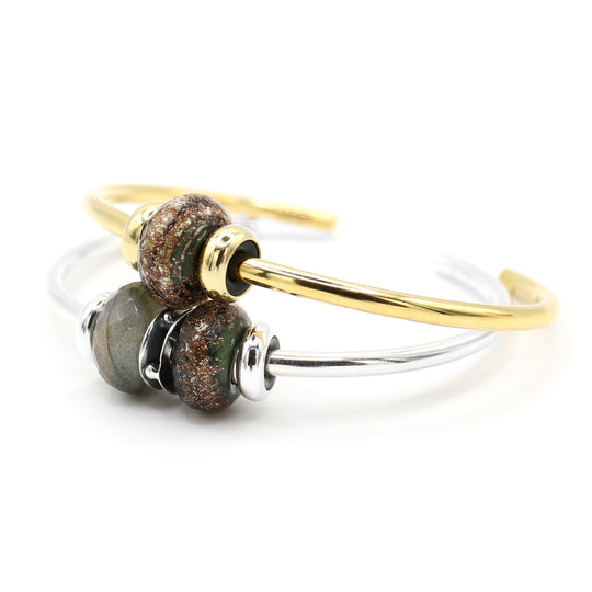 Embrace a blend of timeless charm and celestial beauty with the Golden Treasures Silver Bangle. At the heart is the Limited Edition Golden Treasures Bead, where golden swirls ripple through a warm ivory core, reminiscent of a sunset over shimmering sand. Paired with the Labradorite Bead, a gemstone known for its ethereal glow, and the elegant Moments Connector Bead, this bangle creates a captivating interplay of light and texture.
