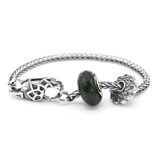 Lose yourself in the ever-changing beauty of the Mystic Reflection Bracelet, a mesmerising blend of light, colour, and symmetry. At its core, the Forest Reflections Bead glows with deep green sparkles against a dark backdrop, mirroring the mysterious shimmer of moonlight on enchanted forest leaves. The Kaleidoscope Bead, with its intricate, shifting patterns, symbolises transformation and new perspectives, while the Mandala Clasp brings balance and harmony, echoing the interconnectedness of nature and self.