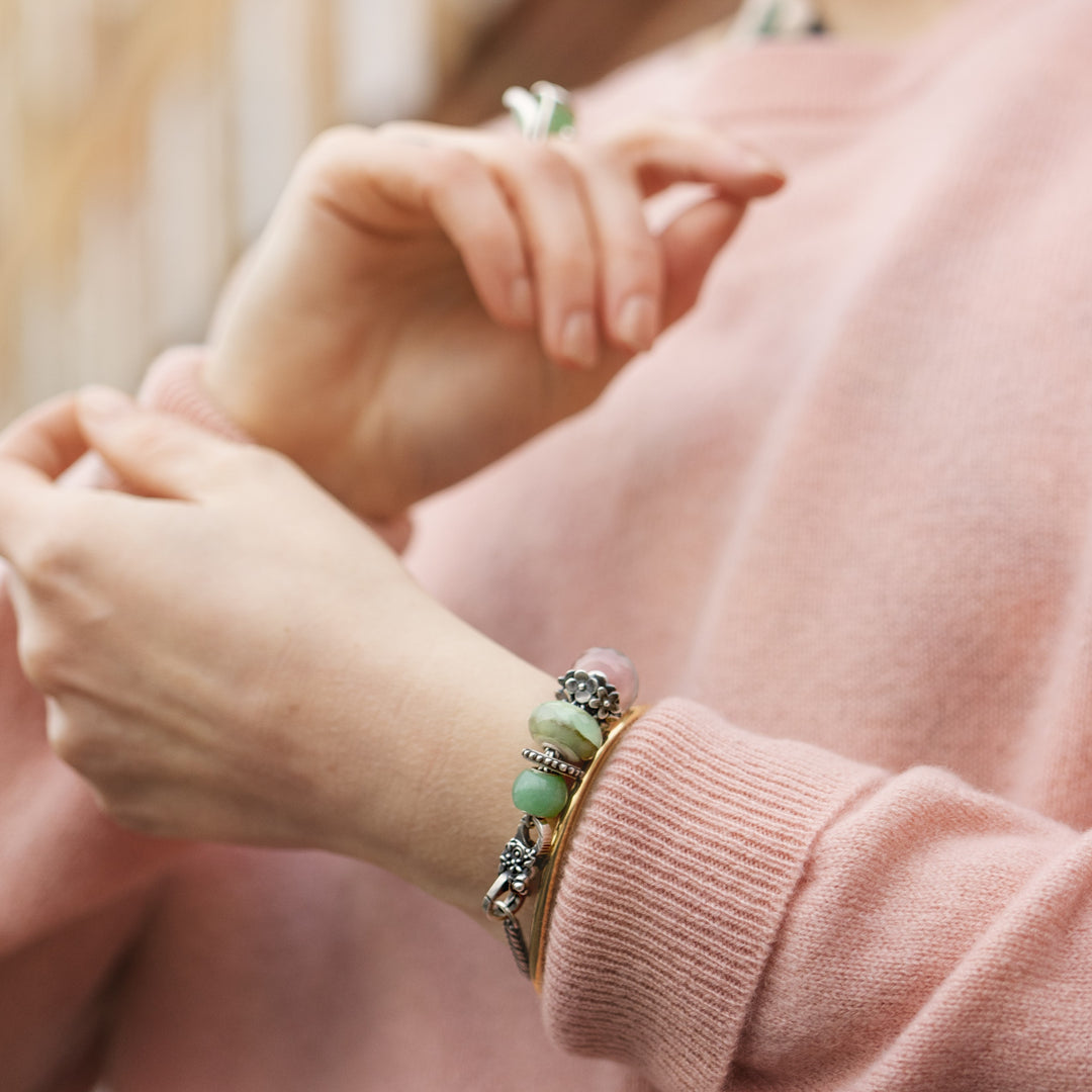 A silver bead adorned with flat flower petals on both sides, offering versatile styling options. A reminder that true beauty often lies in the smallest of details, it makes a stunning complement to the Lakeshore bead.