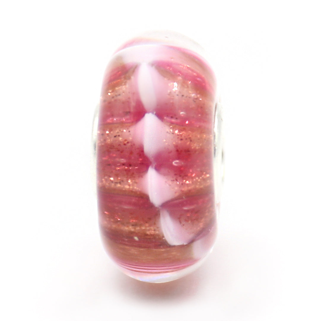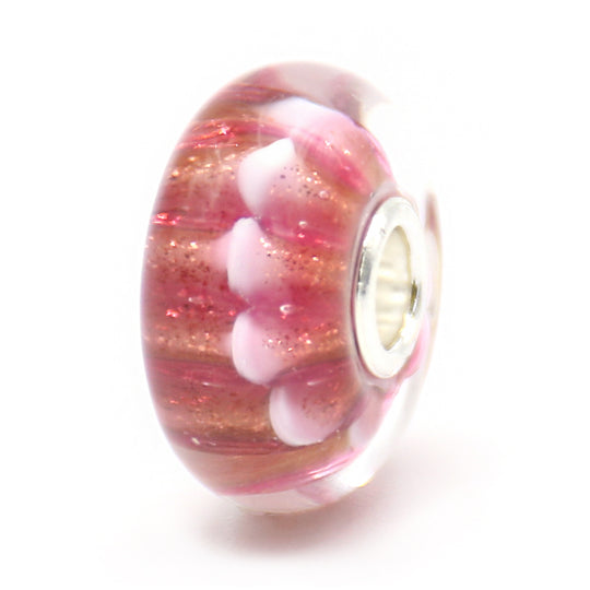Soft and radiant, the Tenderness Bead glows with warm hues of rose pink and shimmering gold. Delicate white and pink petal-like details wrap gently around the glass, evoking feelings of love, care, and quiet strength. A beautiful reminder that even the smallest gestures of tenderness can leave a lasting impression.