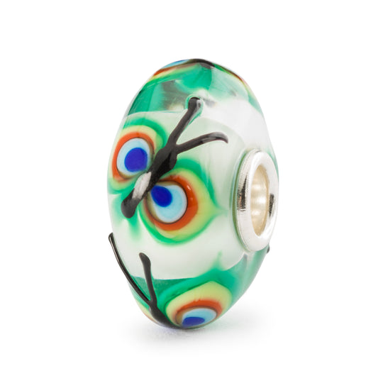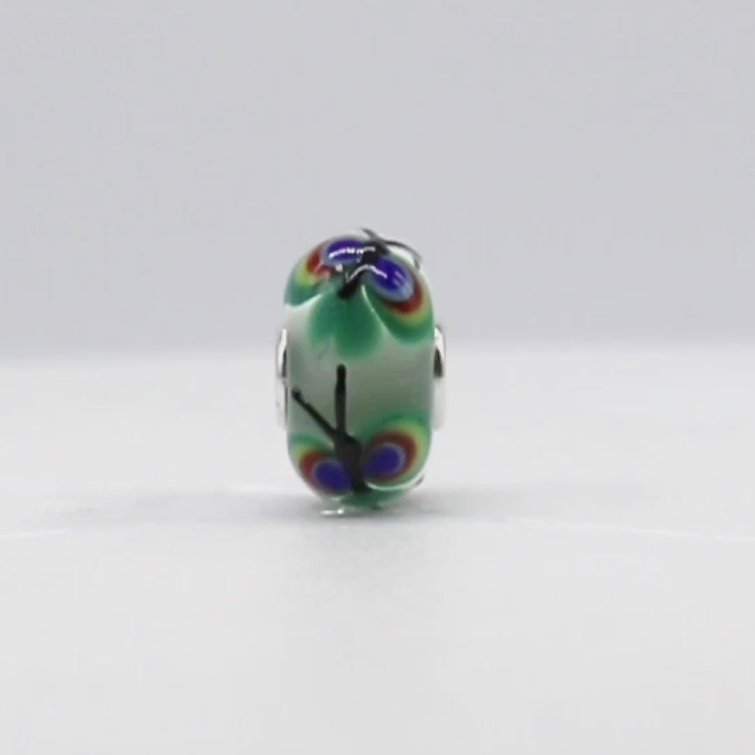 At the heart of this exquisite bead lies a core of pristine white glass, providing the perfect canvas for the vibrant butterfly design that adorns its surface. Delicate wings in hues of greens, reds, yellows, and blues unfurl gracefully, evoking the enchanting beauty of a fluttering butterfly in a sun-kissed garden. The bead is finished with a Sterling silver core.